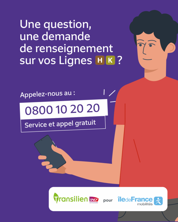 C’est le numéro pour toute question concernant les transports sur votre ligne. Résultat de la collaboration entre Île-de-France Mobilités, Transilien SNCF Voyageurs et RATP, ce numéro unique et gratuit permet de répondre à vos questions.